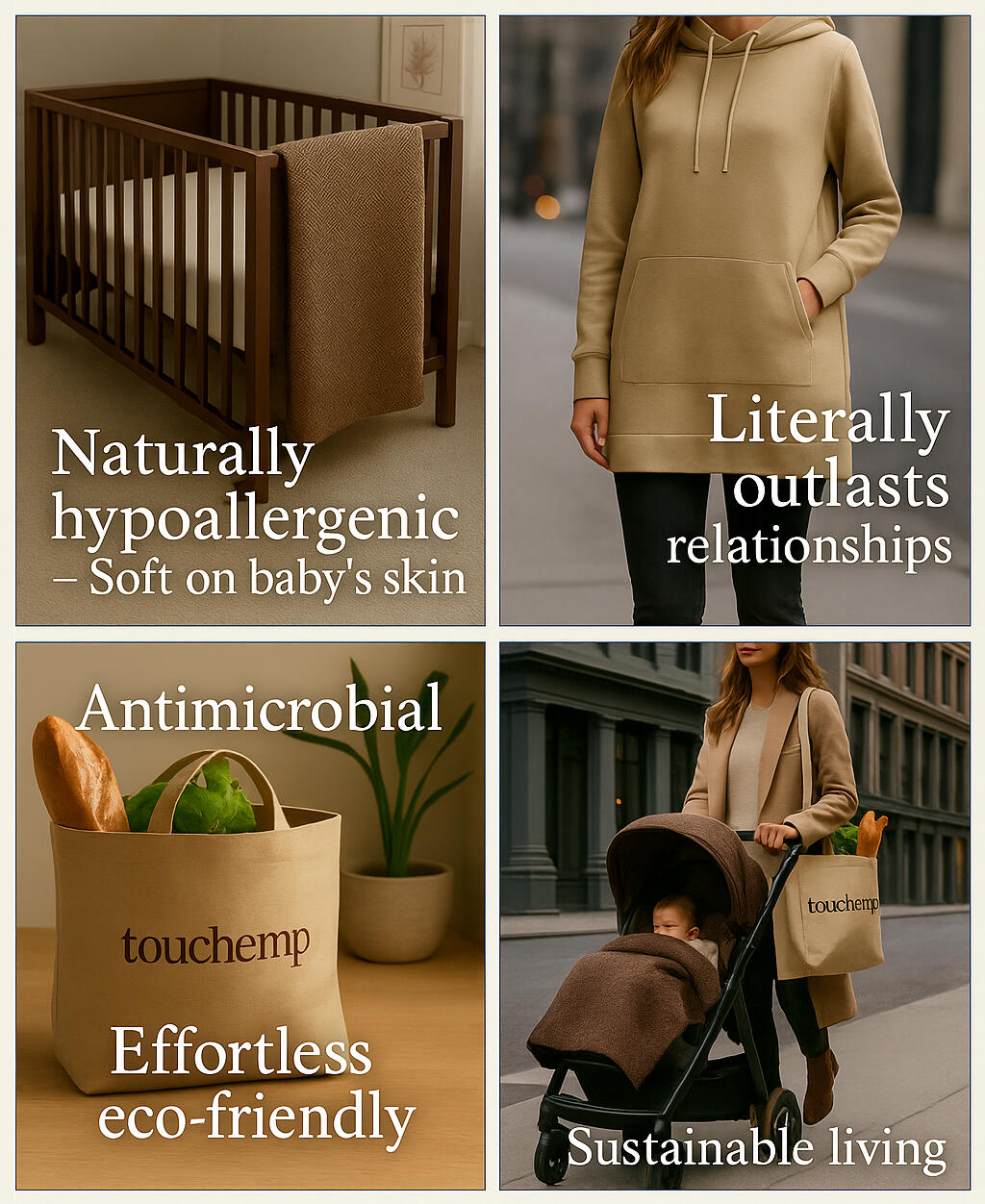 Touchemp designs fabric with function and feeling. Each piece is made from 100% hemp—a material that’s naturally antimicrobial, breathable, and built to evolve with use. Our hoodie, blanket, and tote aren’t just products. They’re essentials designed to stay in your life and out of the landfill.Every piece from Touchemp is designed to last—not just physically, but emotionally. We use sustainable hemp fabric that softens and strengthens over time, creating items that age with you and become more meaningful through use.From the boyfriend hoodie to the baby blanket to the everyday tote, our products are built to be kept, loved, and remembered.